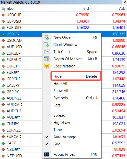 In MT4, go to Market Watch, right-click the symbol you wish to hide, and choose “Hide” from the menu.