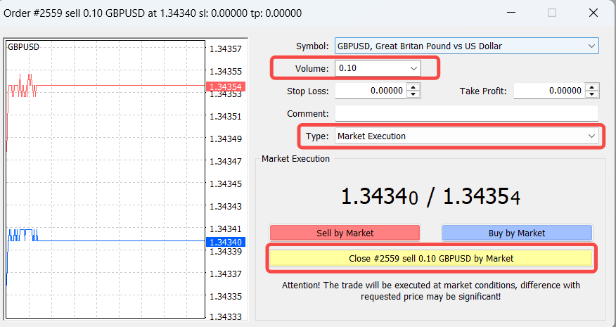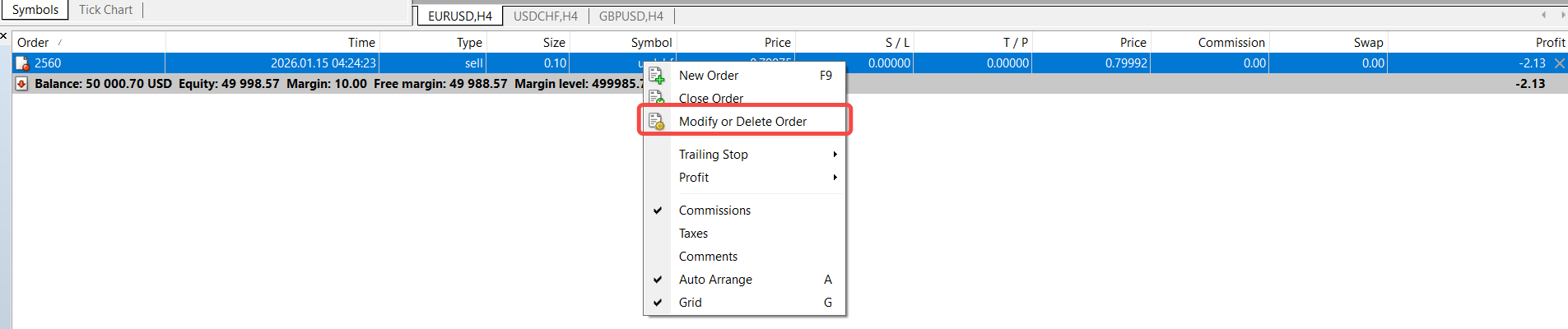 - Right-click the position and choose “Close Order” in MT4 or “Close Position” in MT5.