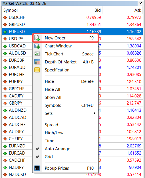 - Right-click the desired instrument in Market Watch and select “New Order”.